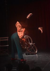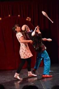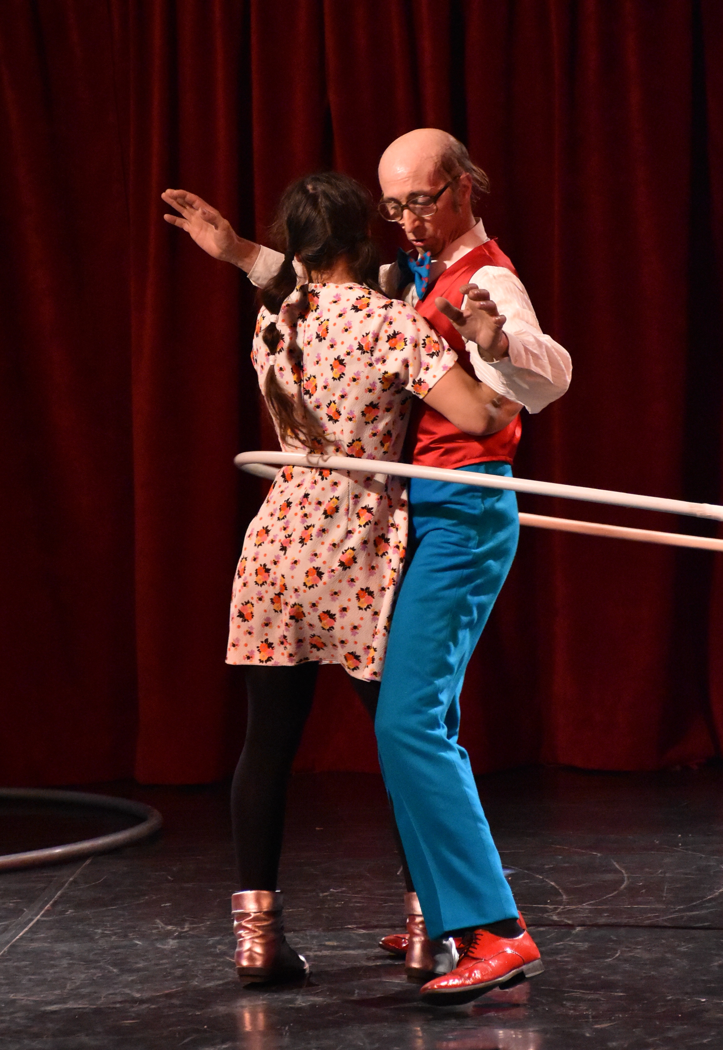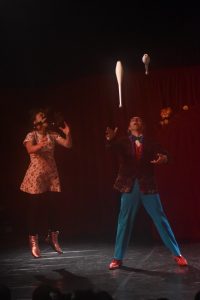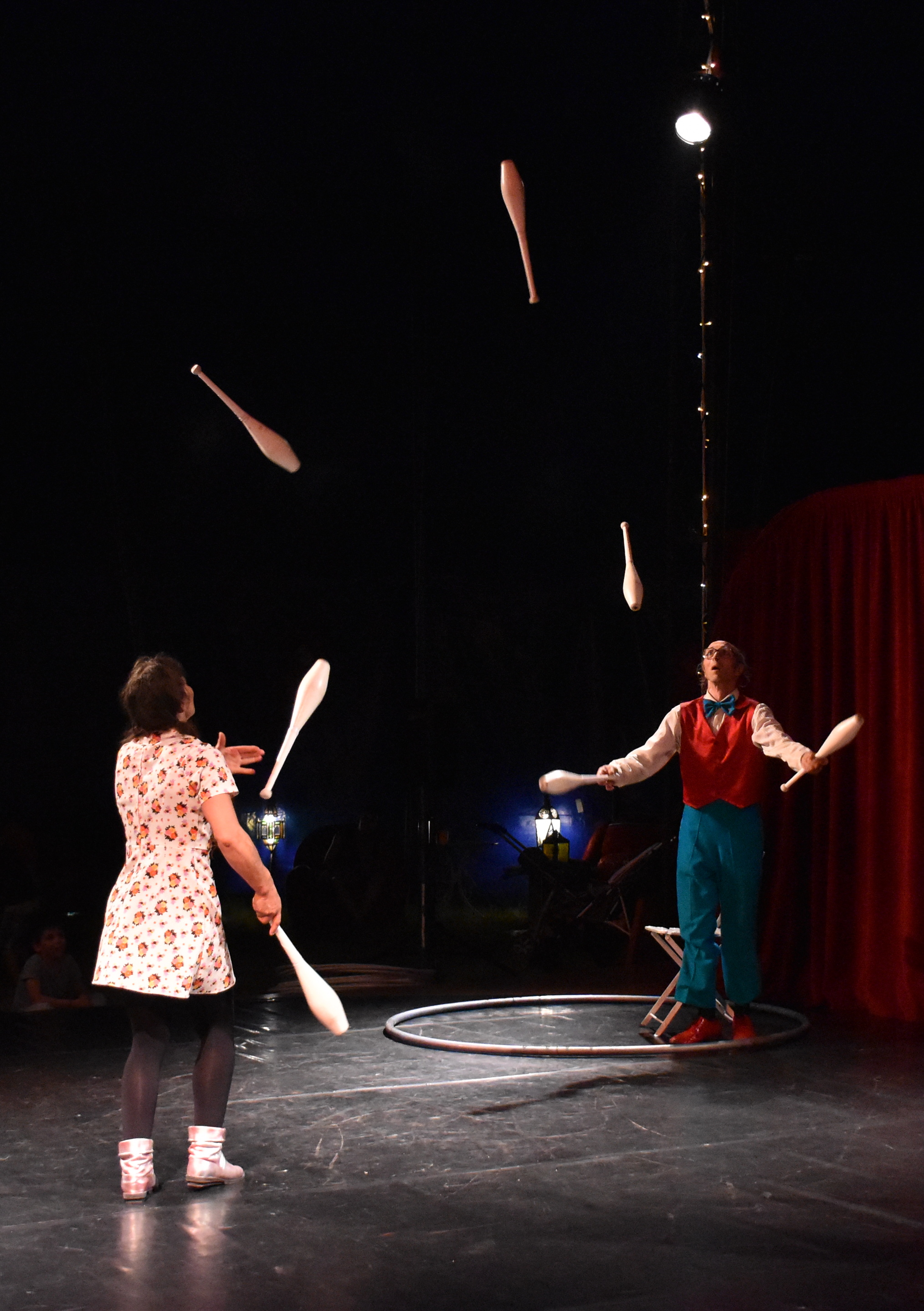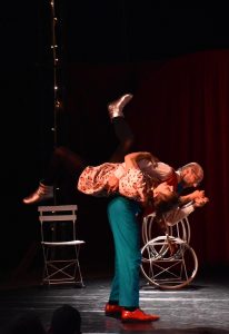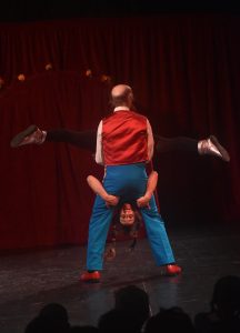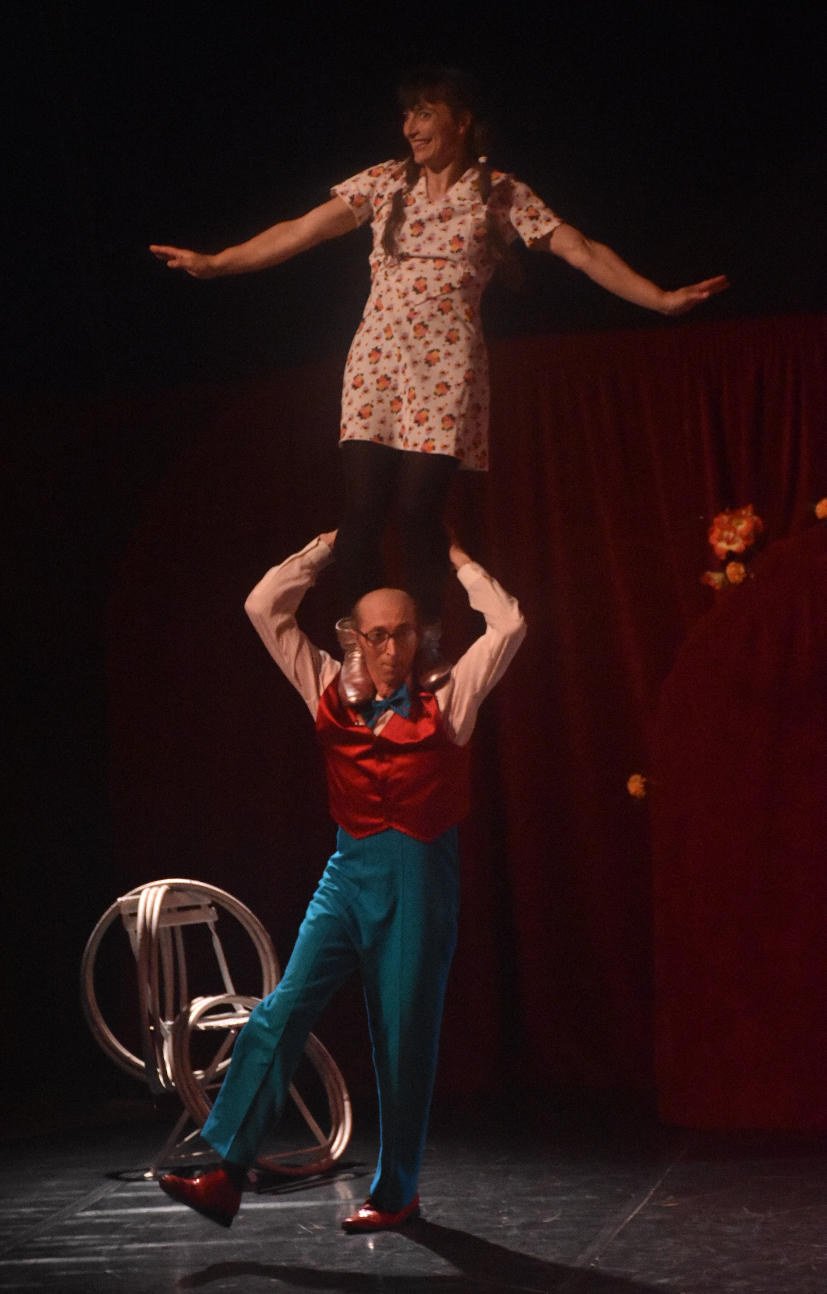 Joyeux duo bancal du coté cérébral mais pas complètement, qui pendant près de 45 minutes va se retrouver dans des situations ubuesques et déjantées, laissant la part belle tant à l’absurde qu’au concret, en conflit direct entre l’un et l’autre, offrant des palettes de jeux à moult propositions… Autour des Arts du Cirque, le choix délibéré d’un humour qui entretient un rire franc en évitant délicatement une dérision dévalorisante.